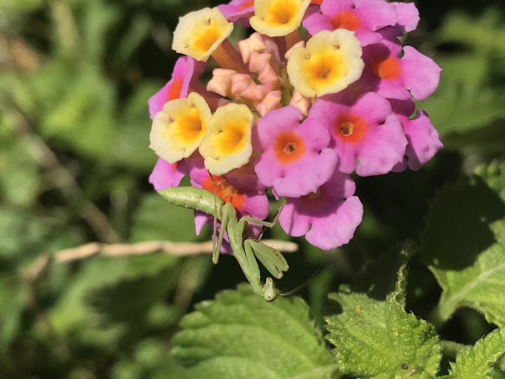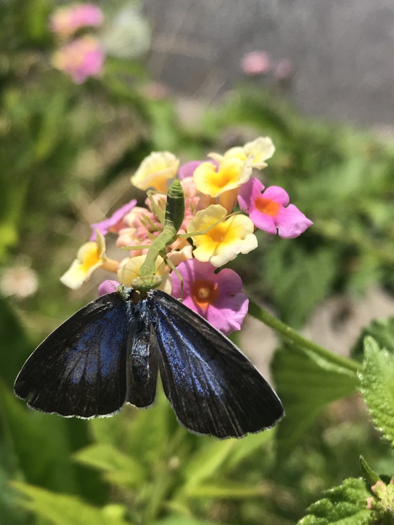 これは2年ほど前に撮影した捕食中のカマキリの写真です。小さな幼齢記のカマキリです。大きさとしては2−3cmの子どもです。愛知県の名古屋市内の本当に街中の道路脇の花壇で偶然目に入りスマホで撮影したものです 小さくてもカマキリはカマキリですね。立派なハンターです。このように都会の真ん中でも色々な昆虫を見かけます。その気になって探していくと驚くようなものまで見ることができます。以前大阪の北新地でオニヤンマを見たことがあります。まだまだ知らない世界がすぐ近くにあるのだなと思います