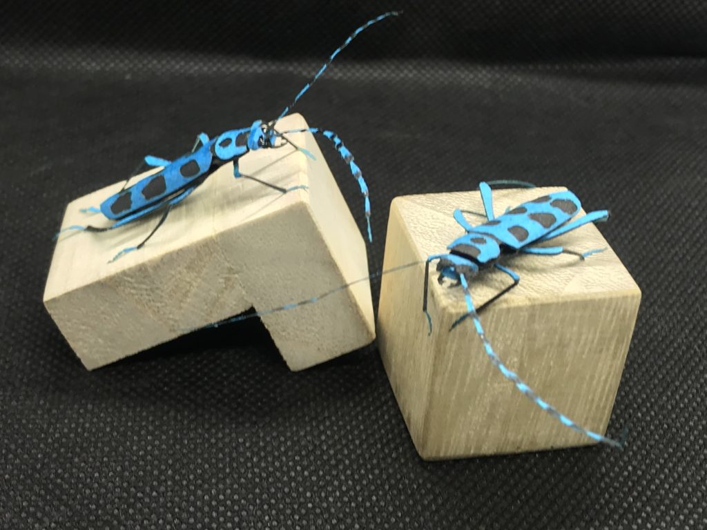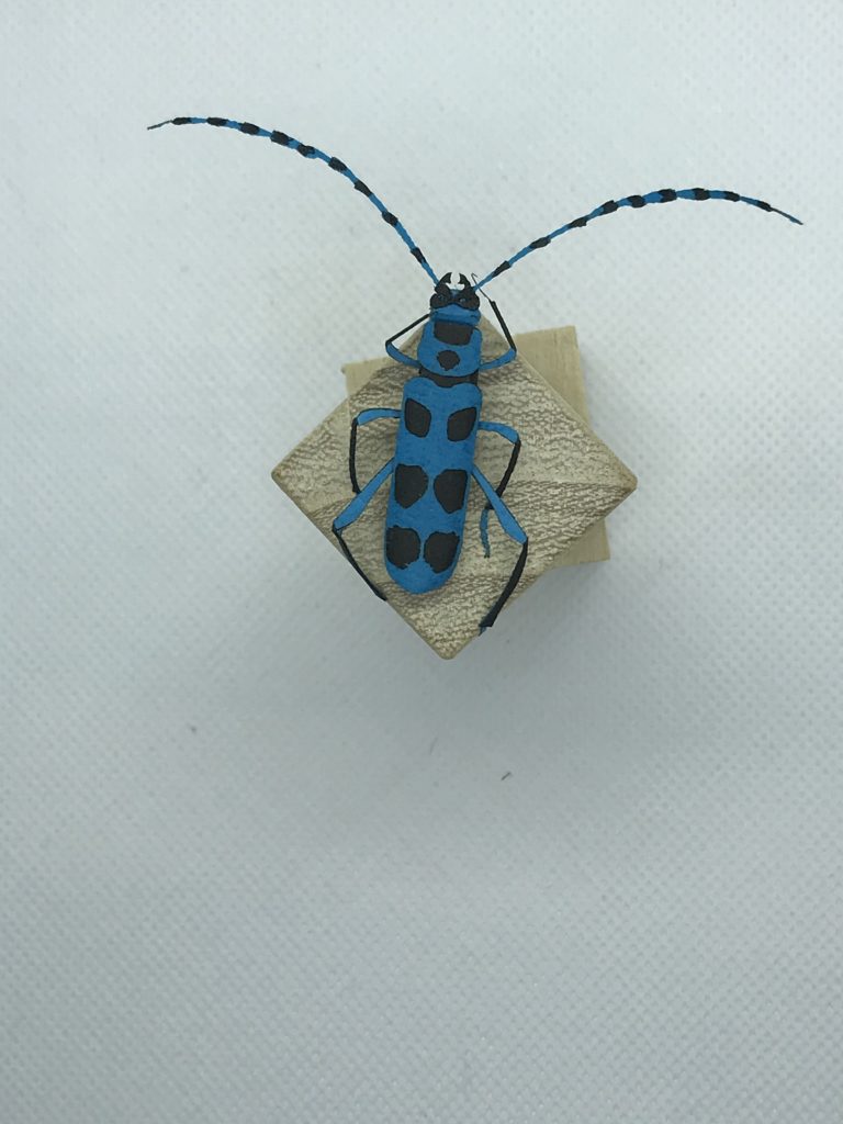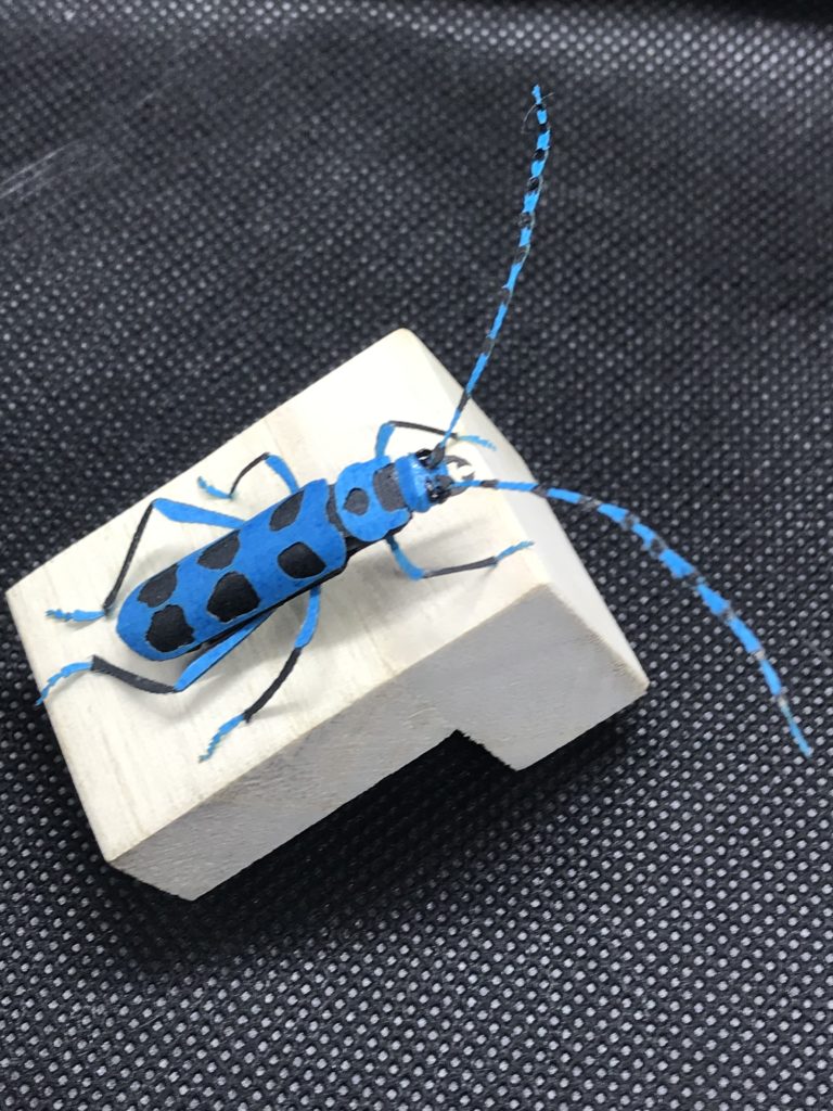 美しい青をまとった15mmから25mm前後の日本では中型のカミキリムシです 作るにあたりヤフオクで実物を購入してしまいました。作品自体は体長35mm で 実物の1.5倍ぐらいの大きさです。実物大は細かくて作り切れませんでした。次は実物大挑戦したいと思います。