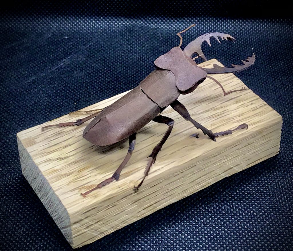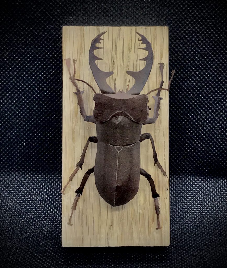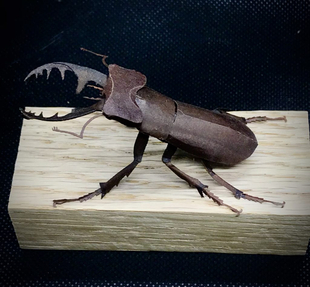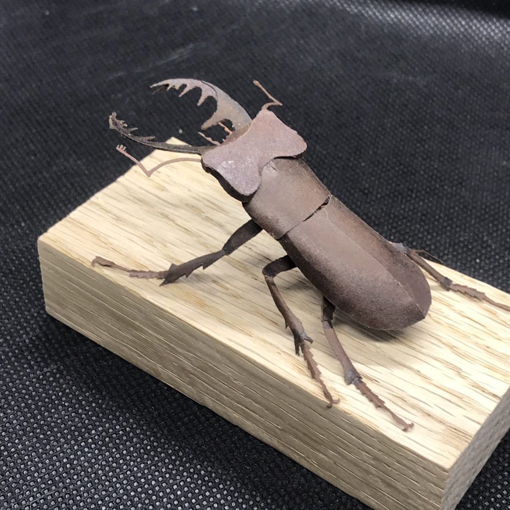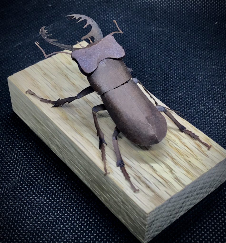 ミヤマクワガタを作成してみました。 紙で昆虫を造りだした一番最初が ミヤマクワガタです。何度も型紙を作り直して今の形になりました。 まだこれからも改良を重ねていくつもりでおります。 ミヤマクワガタは漢字では深山鍬形と書きます 標高が高めのところに生息をするクワガタです。子どもの頃は採集するクワガタはほとんどノコギリでした。貴重なミヤマクワガタにはなかなか出会うことができませんでした。採集は一夏に一個体ぐらいでした 自分の中ではクワガタの王様でした。