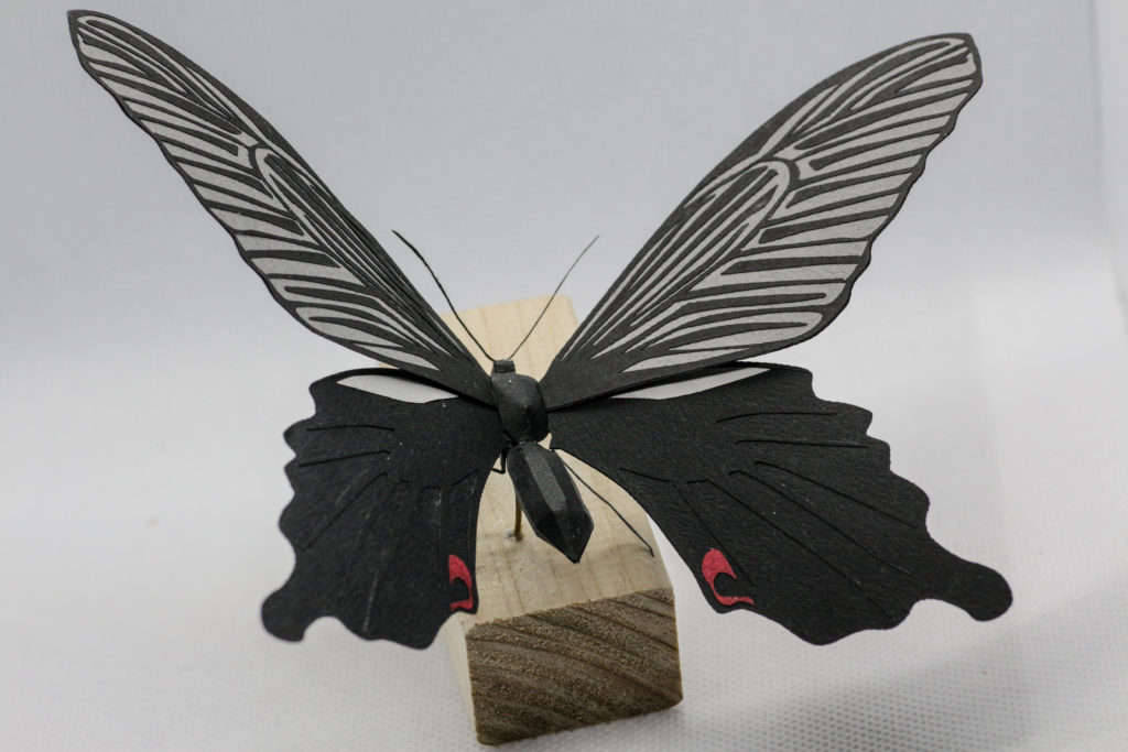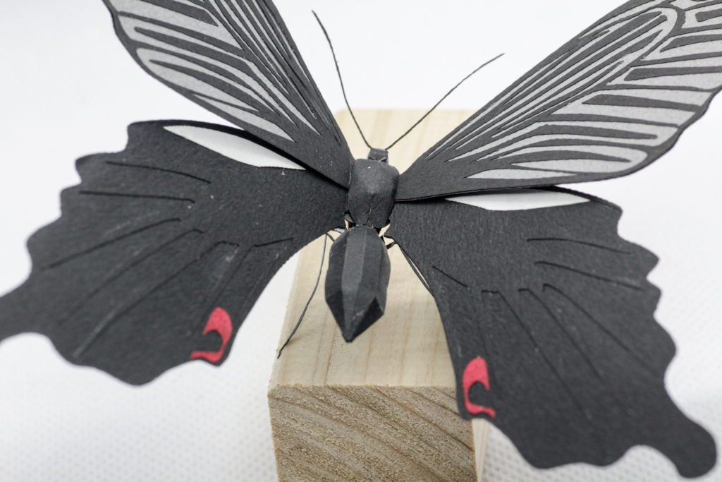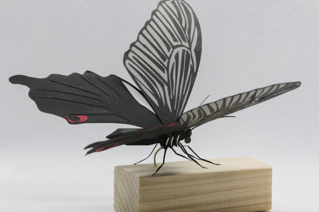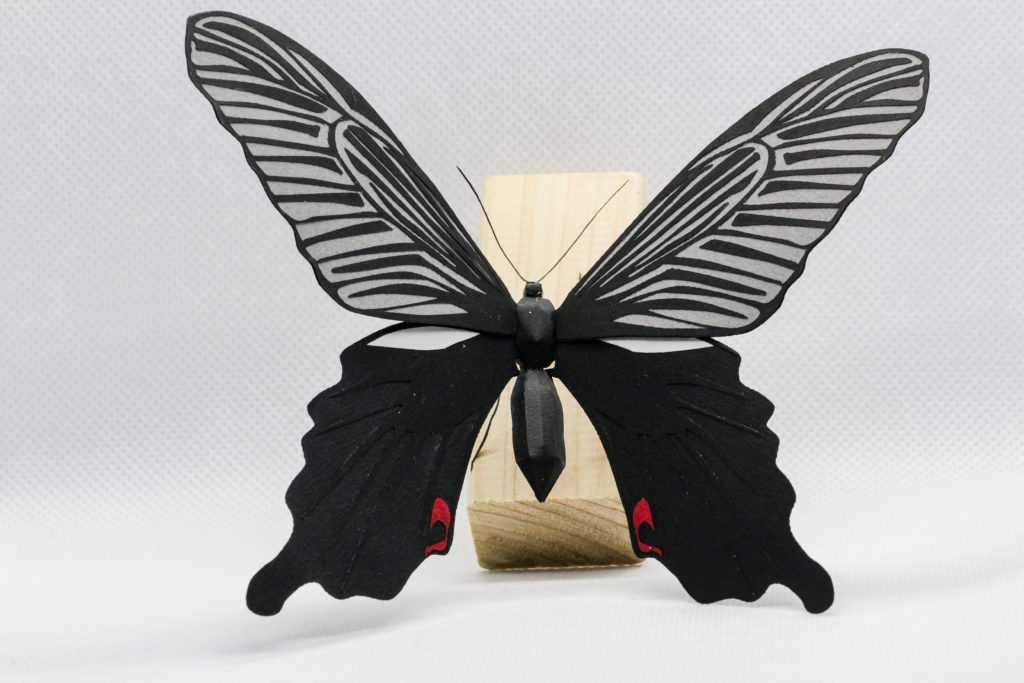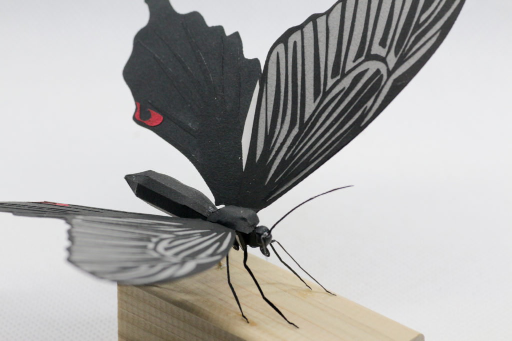 細かい羽根の模様はレーザーカッターを使用してカットしています。触角もいい感じにできました