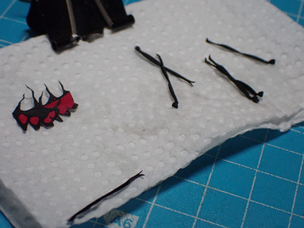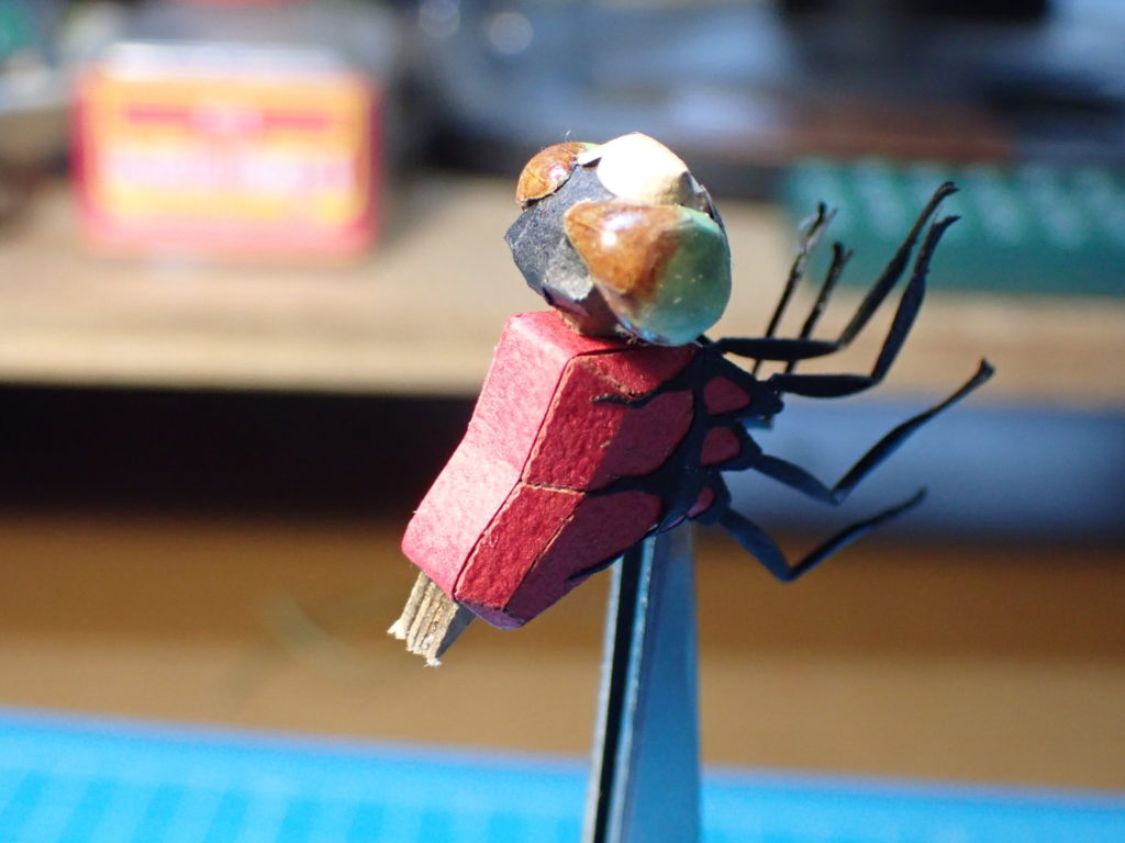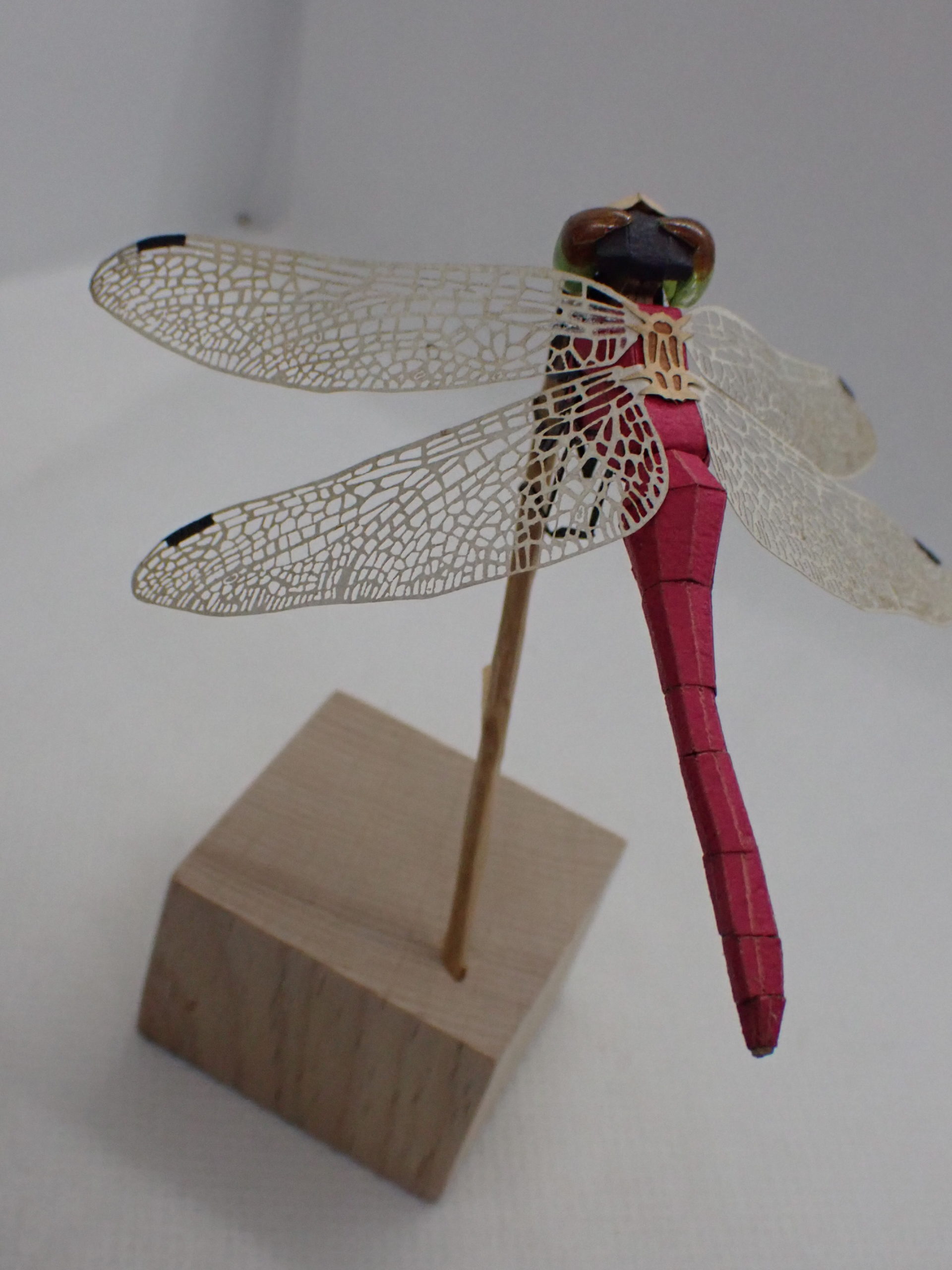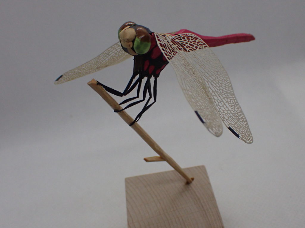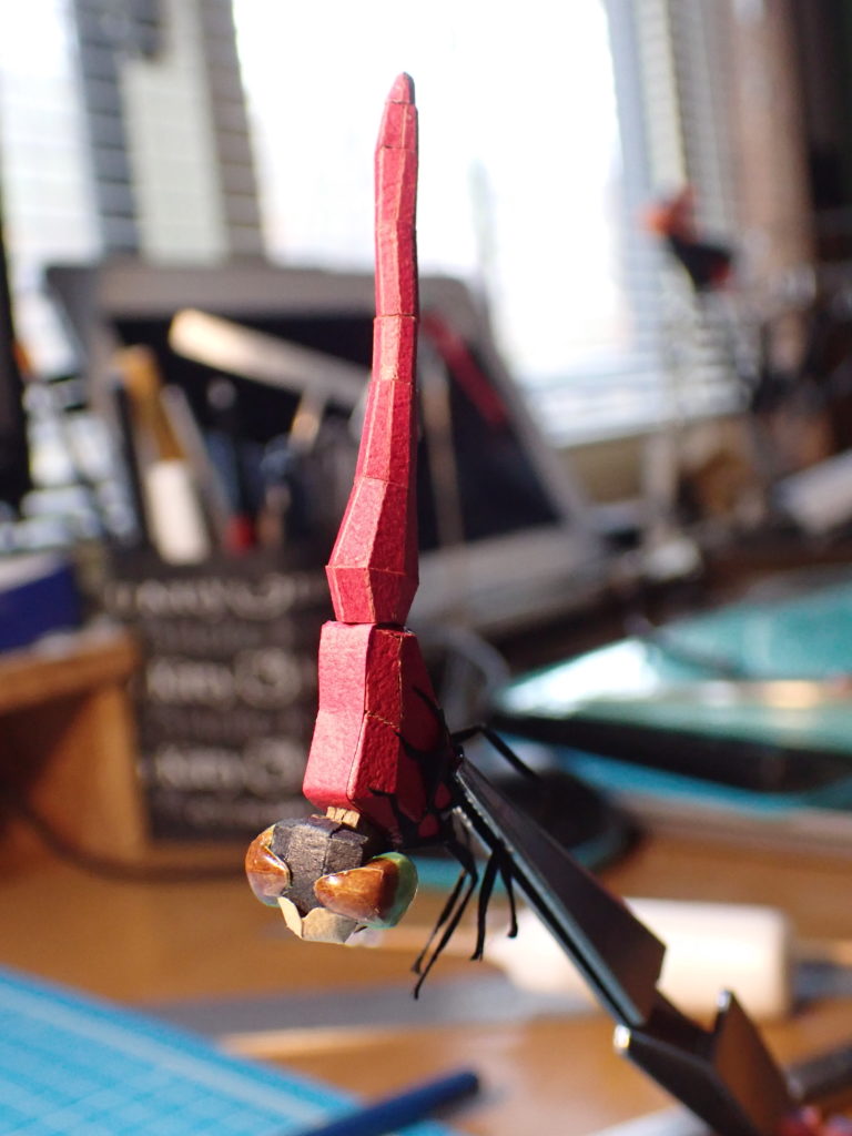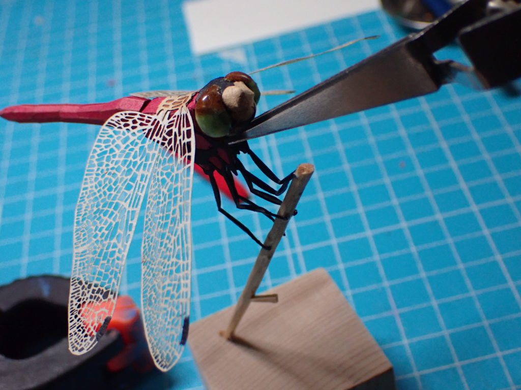 まづは 羽をシオカラトンボではトレーシングペーパーにスジボリで表現をしていましたが 今回 タント紙の切り抜き構造としてみました。あとは足をモデルカステンのカミカタメールという強化剤を使用して補強材なしで侍従を支えることにしました。何とかギリギリ支えられていますが 経年変化では苦しそうです