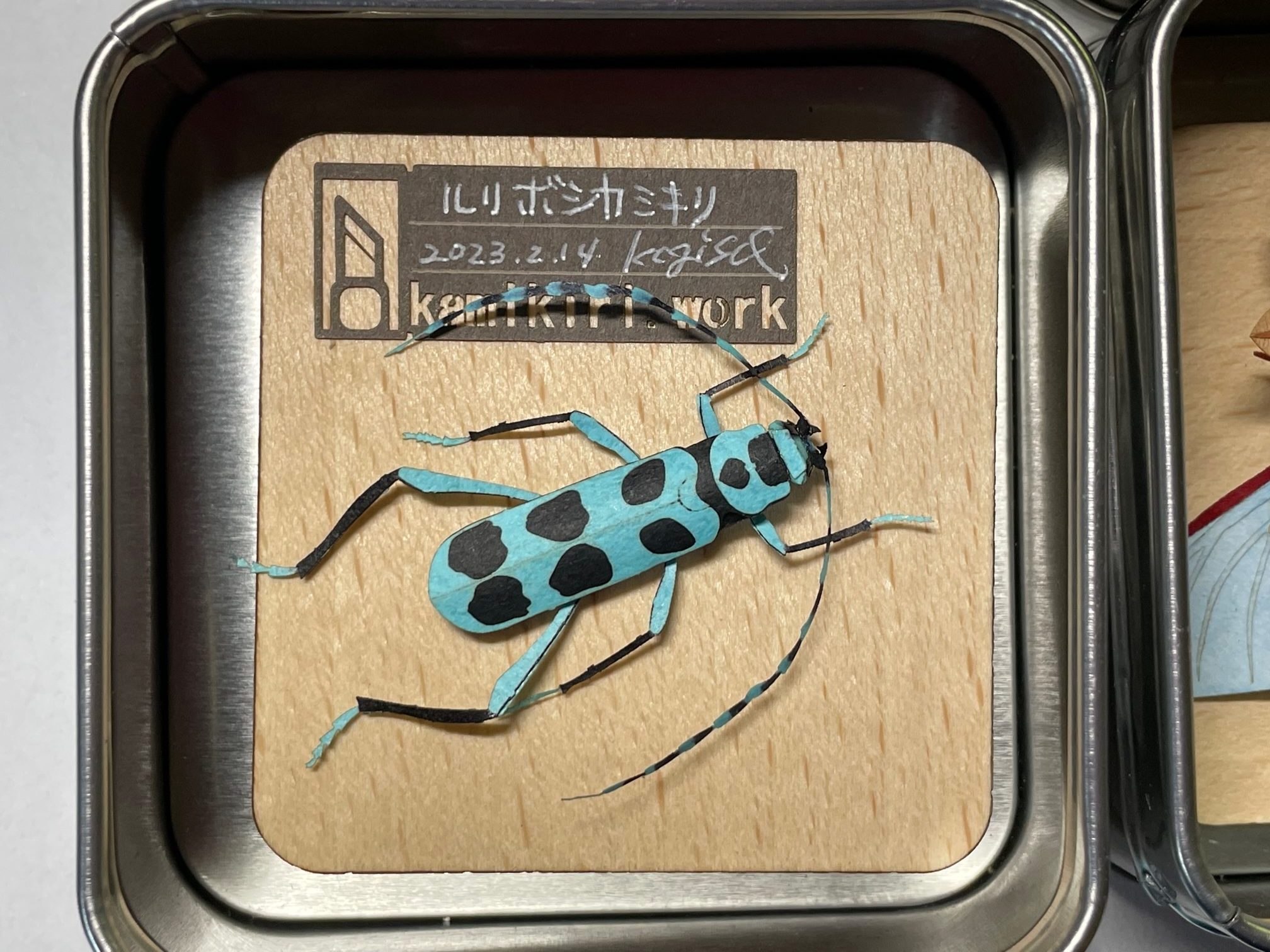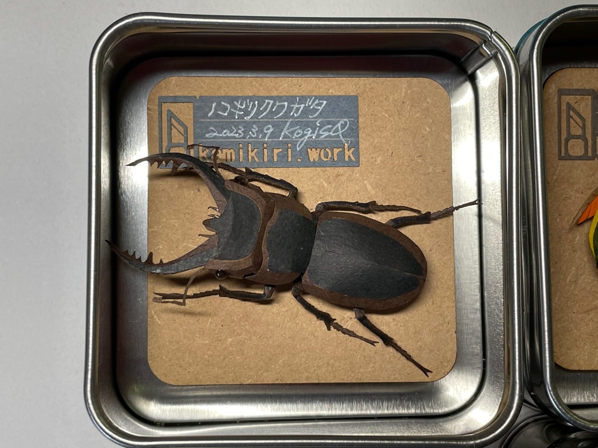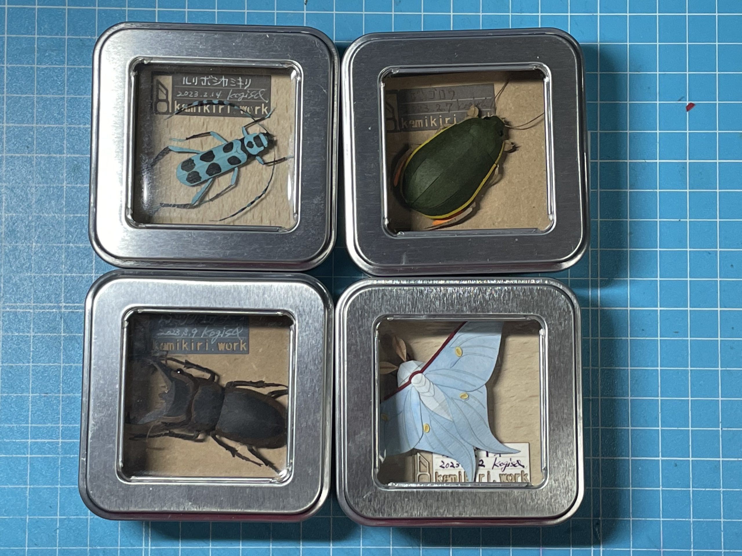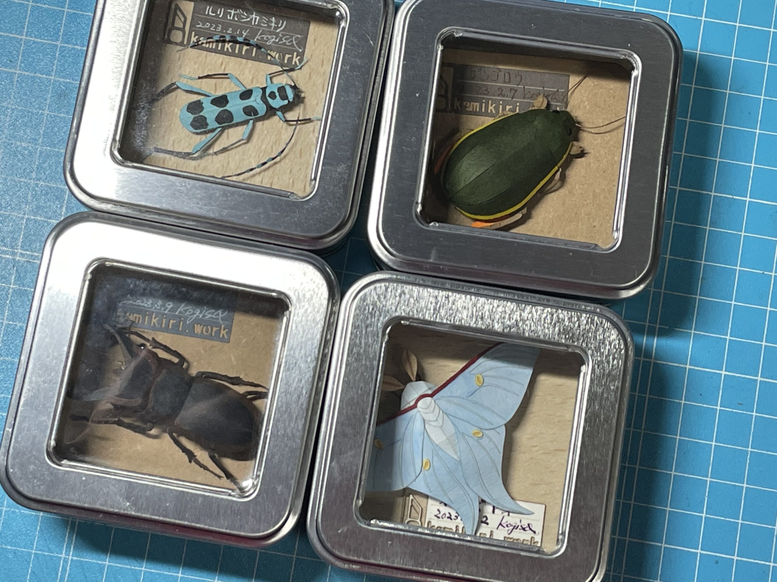 4種類の昆虫ペーパークラフトを 缶ケースに収めて昆虫標本仕立てのディスプレイにしてみました。