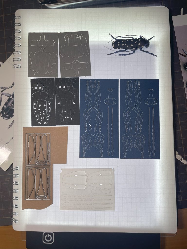 カミキリムシは以前にルリボシカミキリを作っていますが 今回ボディ構造を見直した形で作成をしました 少し前にラミーカミキリを作りましたがそれの構造を基本に型紙を作成しました。