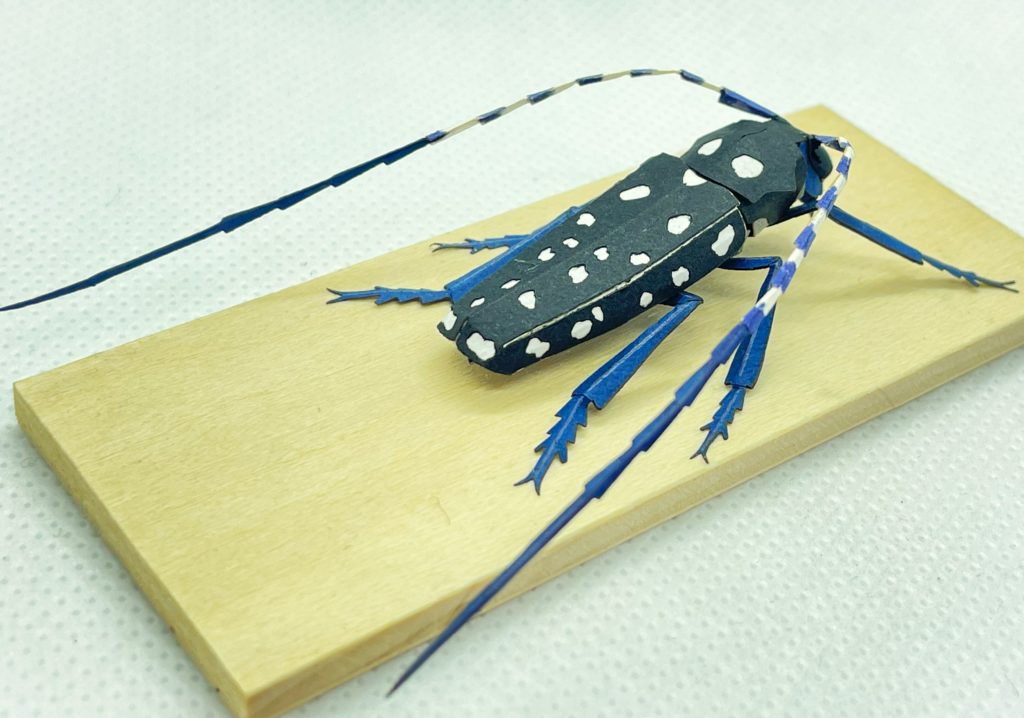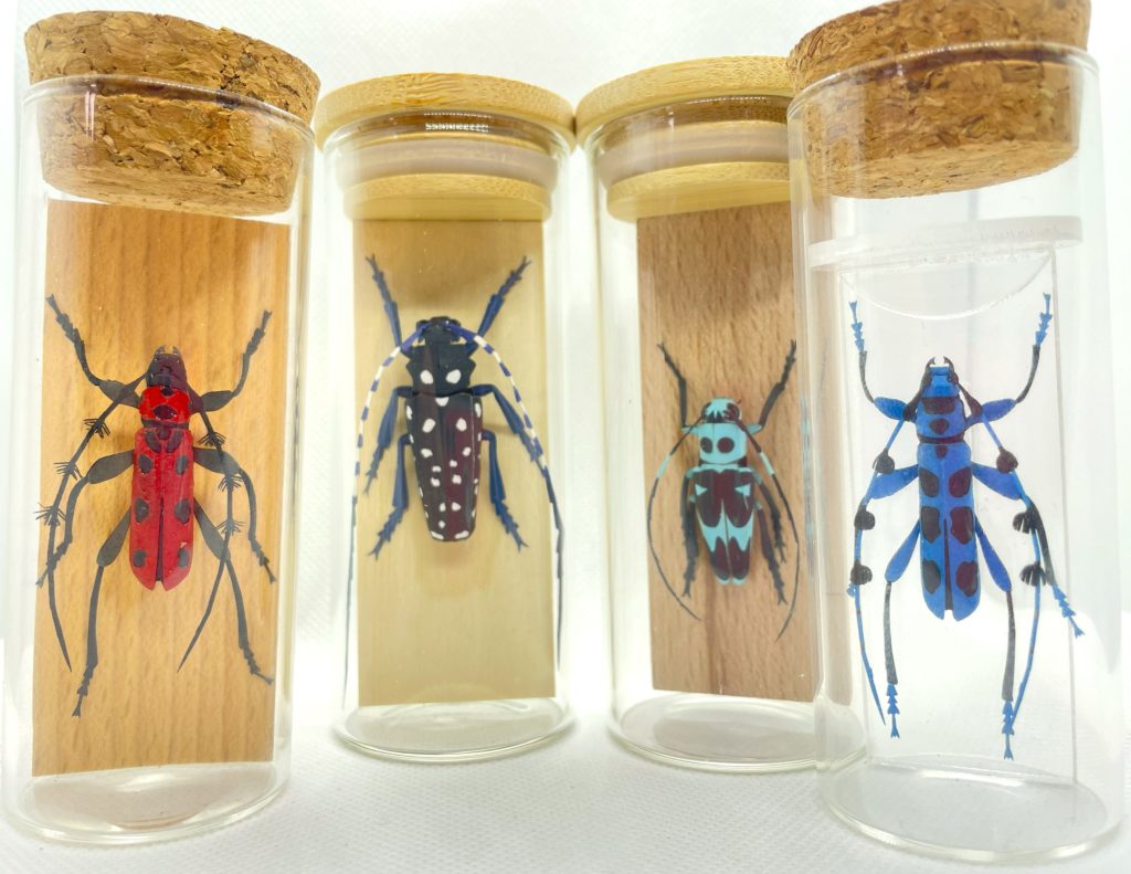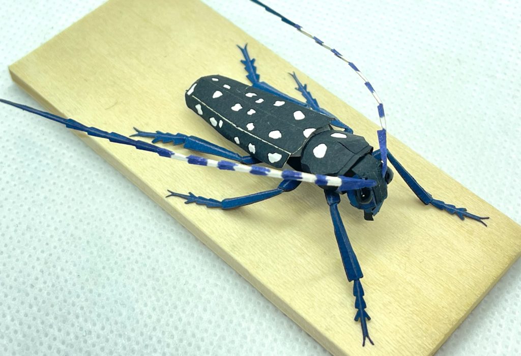 今迄に作ったカミキリムシ4体になります右から「ルリボシカミキリ」「ラミーカミキリ」「ゴマダラカミキリ」「ベニボシカミキリ」になります