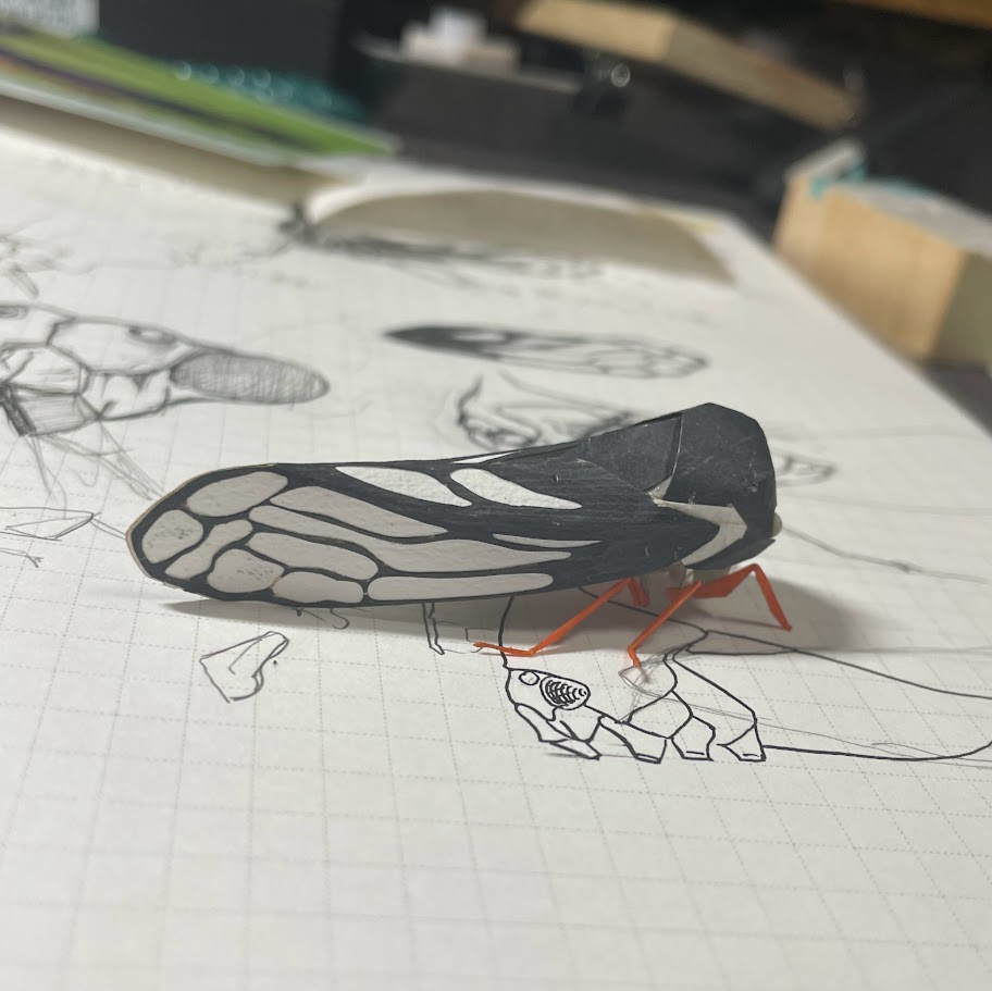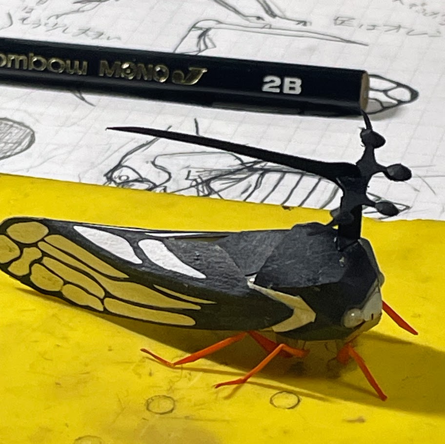 変な虫代表ツノゼミを作ってみました 本物は体長5-6mmなので1/1では再現無理なので約6㎝の大きさで(10倍)で造っています。構造的には以前の作品ミンミンゼミをベースに作成しましたが意外とフォルムが違っていてほぼパーツの流用はありませんでした