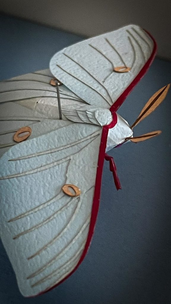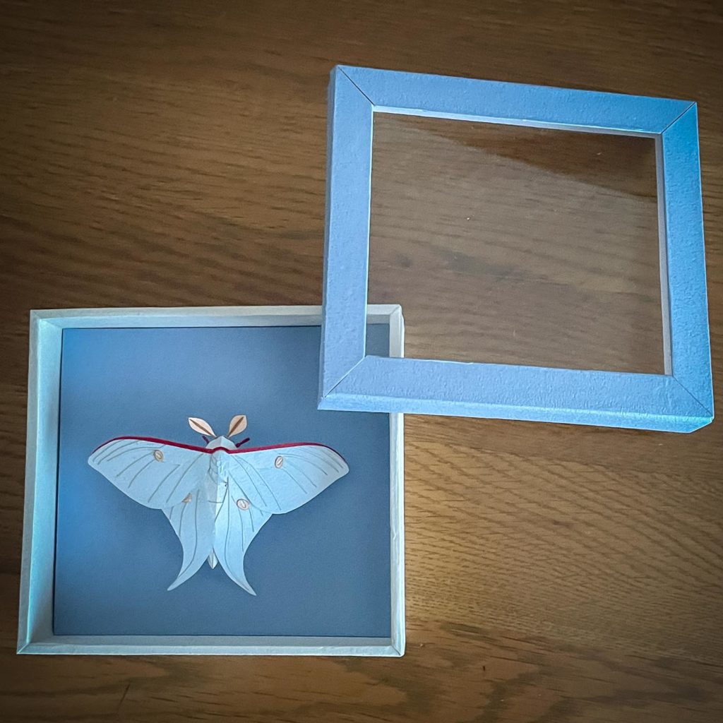 過去の設計データを元に、レーザーカットを用いてオオミズアオを制作しました。 標本風のディスプレイにするため虫ピンで固定し、作品サイズに合わせた特製の箱に収めています。